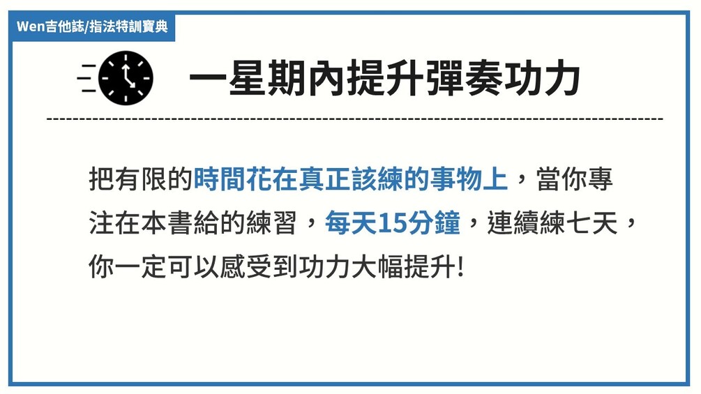 把有限的時間花在真正該練的事物上,當你專注在本書給的練習,每天15分鐘,連續練七天,你一定可以感受到功力大幅提升!